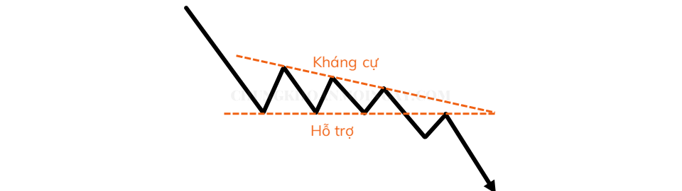 Cạnh dưới của nó (đường hỗ trợ) nằm ngang. Sau khi mô hình Tam Giác hướng xuống được tạo thành, thị trường tiếp tục xu hướng đi xuống.