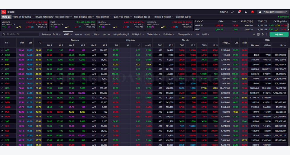 Giao diện giao dịch trên Web của sàn SSI có cả bảng giá cho nhà đầu tư dễ dàng theo dõi.